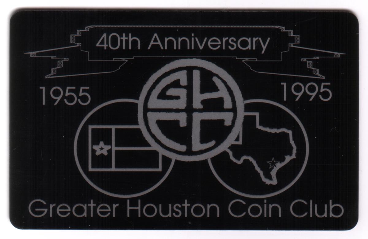 This collectible card commemorates the 40th Anniversary of the Greater Houston Coin Club, covering the years 1955 to 1995. The card is black with etched silver-tone graphics and text. Centered at the top is a banner reading "40th Anniversary" with the years "1955" and "1995" positioned on either side of the card.