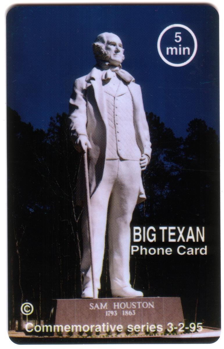 At the base of the statue, there is an inscription: "SAM HOUSTON 1793 1863." The phone card includes the text "BIG TEXAN Phone Card" prominently displayed on the right side. A circle in the upper right corner indicates the card’s value as "5 min," denoting five minutes of telephone use. The bottom of the card reads "Commemorative series 3-2-95," identifying the release date in the commemorative series.