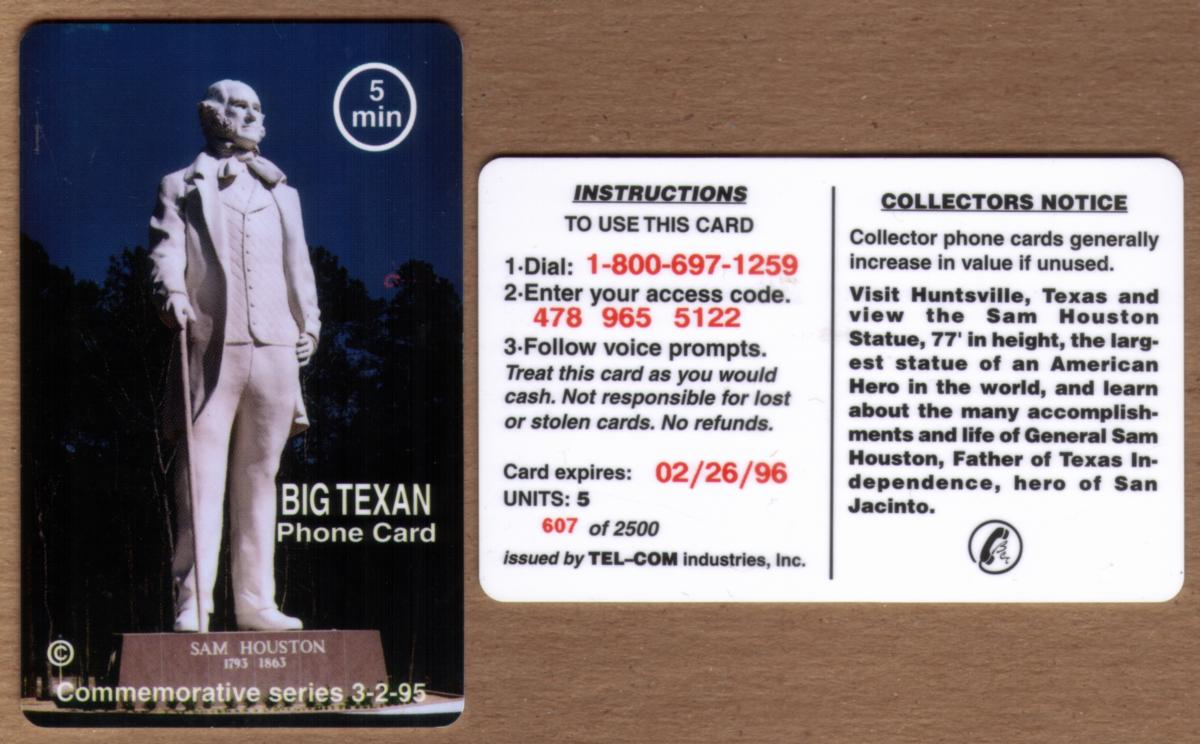 This Sam Houston statue commemorates the historical figure known as the "Father of Texas Independence" and "Hero of San Jacinto." The phone card was produced by Tel-Com Industries and belongs to a series honoring American icons, famous people, political campaigns, and American landmarks.