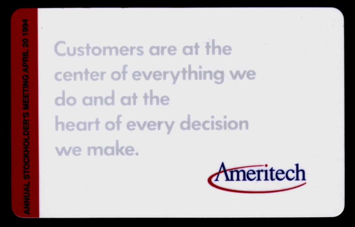 This collectible phone card features the branding and theme related to Ameritech, a telecommunications company. It is a promotional item connected to the April 1994 Stockholder's Meeting, which carried the slogan "Customers Are At The Center." The card highlights Ameritech’s corporate communications and shareholder engagement from that specific time.
