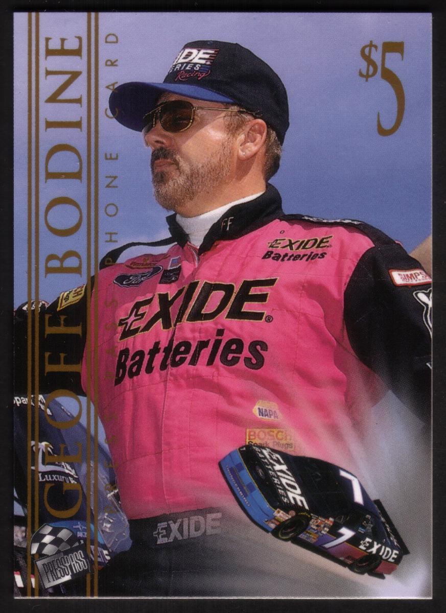 The front of the card includes the name "Geoff Bodine" printed vertically on the left side in gold lettering. A small image of Bodine's black race car, also branded with "Exide," is shown in the lower right portion of the card. The car features the number 7 in white on the roof and sides. The card’s denomination of $5 is shown in gold in the upper right corner.