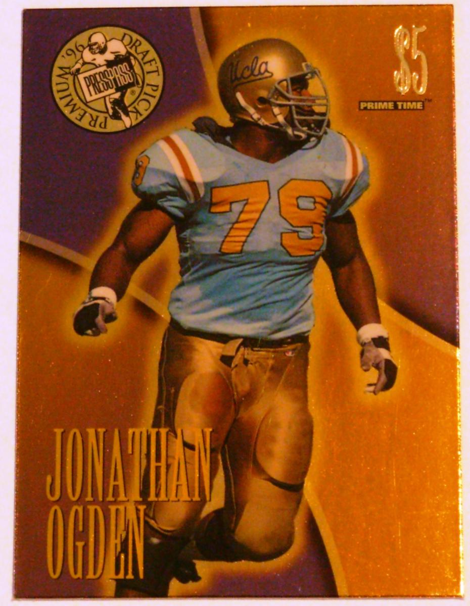 The card design includes a rich, textured background blending purple and gold hues. In the top left corner, there is a circular emblem labeled "1996 Draft Pick" alongside the "Press Pass Football" logo. The card also displays "$5 PRIME TIME" in gold foil in the upper right corner, indicating its value and a special edition or series name. At the bottom left, the player's name "JONATHAN OGDEN" is printed in large gold letters.