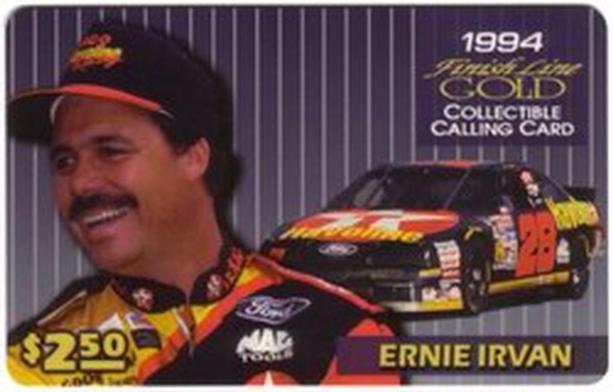 Additional text on the card includes the phrase “Finish Line Racing,” directly relating the subject to the sport. The overall design and branding strongly highlight the automotive and NASCAR racing theme centered on Ernie Irvan and his sponsorships during the mid-1990s racing scene.