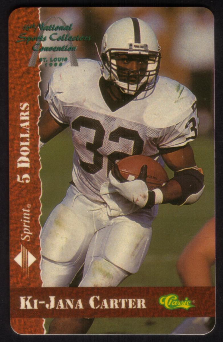 This collectible football phone card features Ki-Jana Carter in full uniform, wearing a white helmet and jersey with the number 32, holding a football in both hands as he runs. The card is valued at 5 dollars and marked with the Sprint logo. It commemorates the 16th National Sports Collectors Convention held in 1995 in St. Louis, as indicated by the text "National Sports Collectors Convention St. Louis 1995" printed in green near the top left of the card.