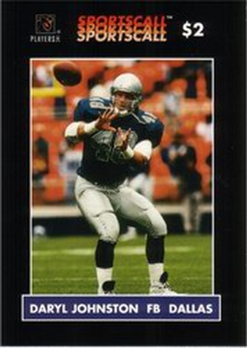 No additional branding or sponsoring logos appear apart from those connected to the NFL and SportsCall. The card’s presentation is clean, with a combination of photographic imagery and printed text that collectively authenticates it as a collectible item centered on Daryl Johnston and professional football within the NFL.