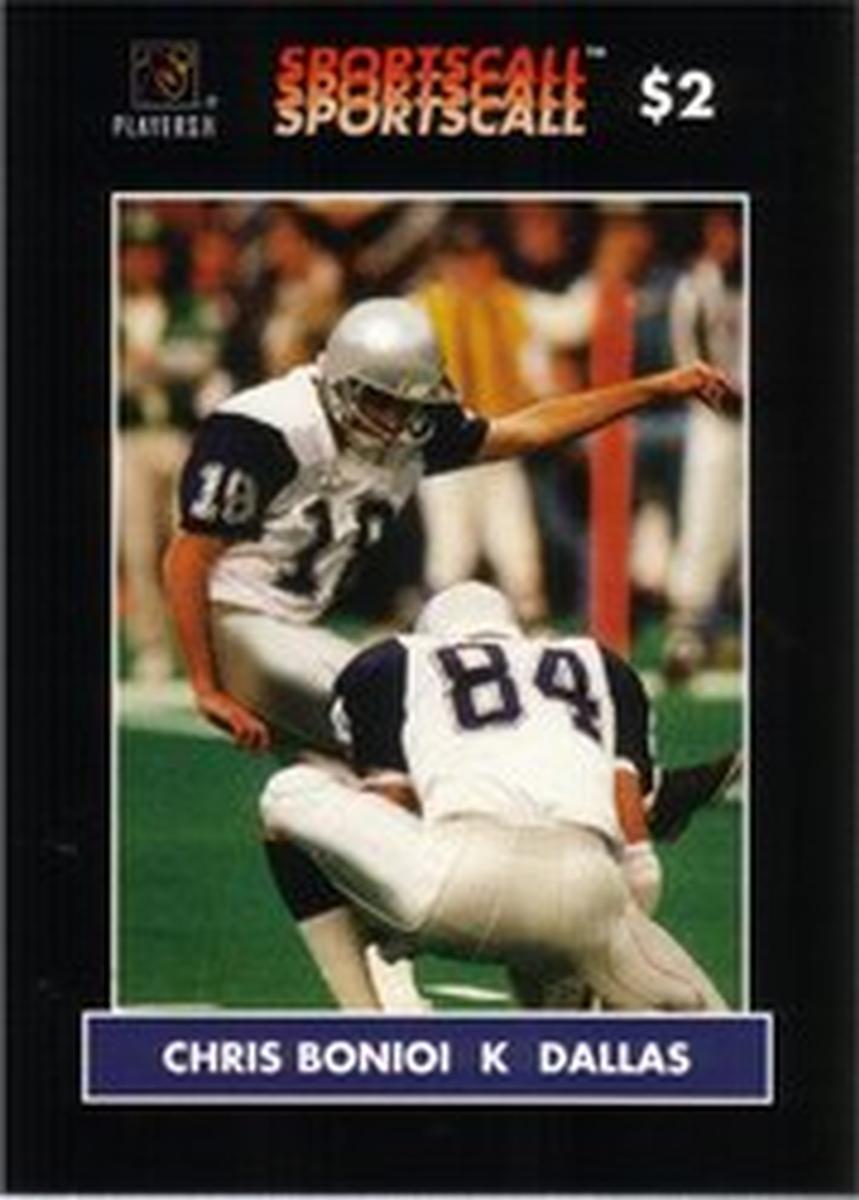 The design includes clear football-themed elements, with text that highlights the sports association and the specific player. The card is officially licensed by the NFL and includes SportsCall branding, further confirming its authenticity as a football collectible item. The card’s layout is clean, with Chris Boniol’s name and team clearly visible, making it a collectible for fans of the Dallas Cowboys and NFL memorabilia collectors alike.