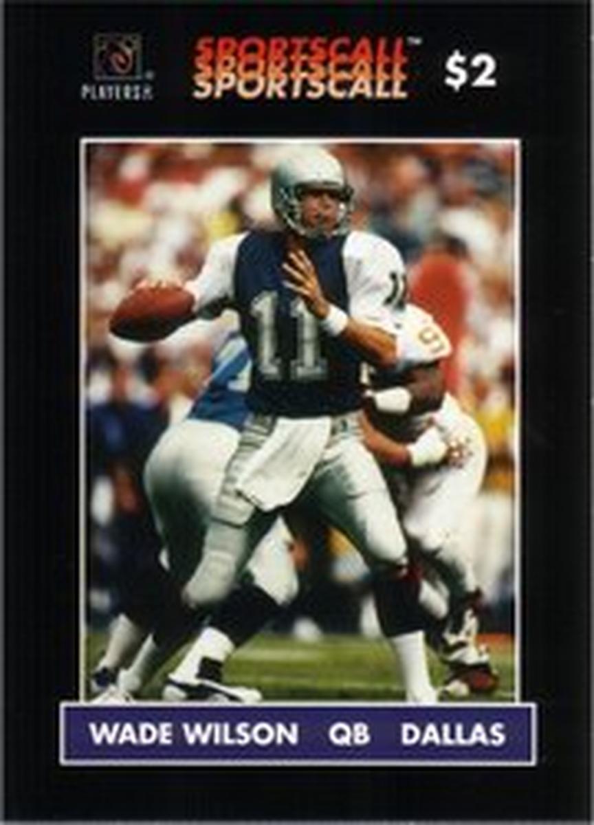 This collectible belongs to a SportsCall series related to football and the NFL, highlighting professional players. The card number is labeled as "#9" in the series. The overall design focuses on the player and team identification, presenting Wade Wilson as a recognized quarterback for the Dallas Cowboys during his active playing career.