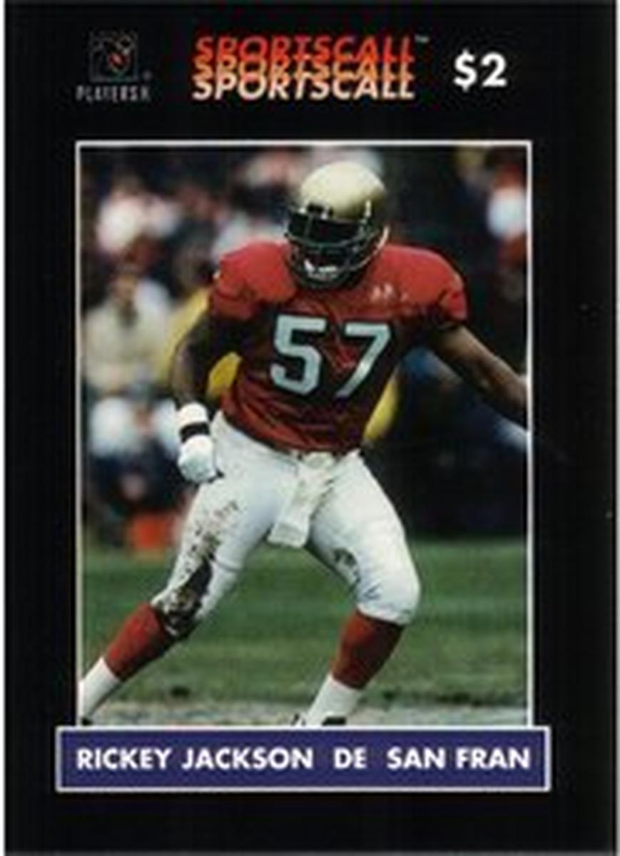The card displays clear branding, including the SportsCall and NFL logos placed near the top. Rickey Jackson’s name and position, DE (defensive end), are printed in bold text beneath the image. The team name "San Francisco 49ers Football" is also noted, linking the player with the professional football franchise. The card is rectangular and appears to have crisp edges with no visible signs of wear.