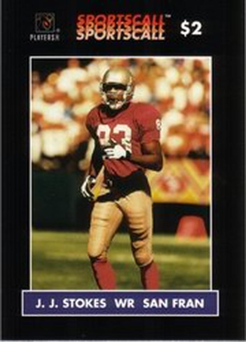 Overall, this card represents a licensed collectible centered around the sport of football, highlighting J.J. Stokes and his role as a wide receiver for the San Francisco 49ers within the NFL framework.