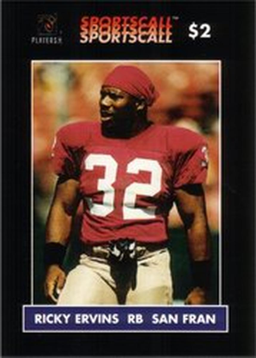 Overall, this SportsCall paper collectible captures Ricky Ervins in his professional football role during his time with the 49ers. The card maintains clean, straightforward branding related to the NFL and the player without additional graphic clutter.