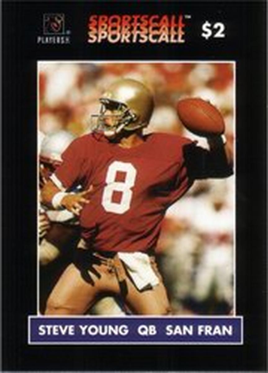 This collectible card features Steve Young, quarterback for the San Francisco 49ers, an NFL team in the National Football League. The card is numbered 20 and is part of the SportsCall series, made of paper. Steve Young is depicted wearing his red and gold San Francisco 49ers uniform, complete with the team helmet and white jersey with red trim. He is shown in a poised stance, ready to throw a football.