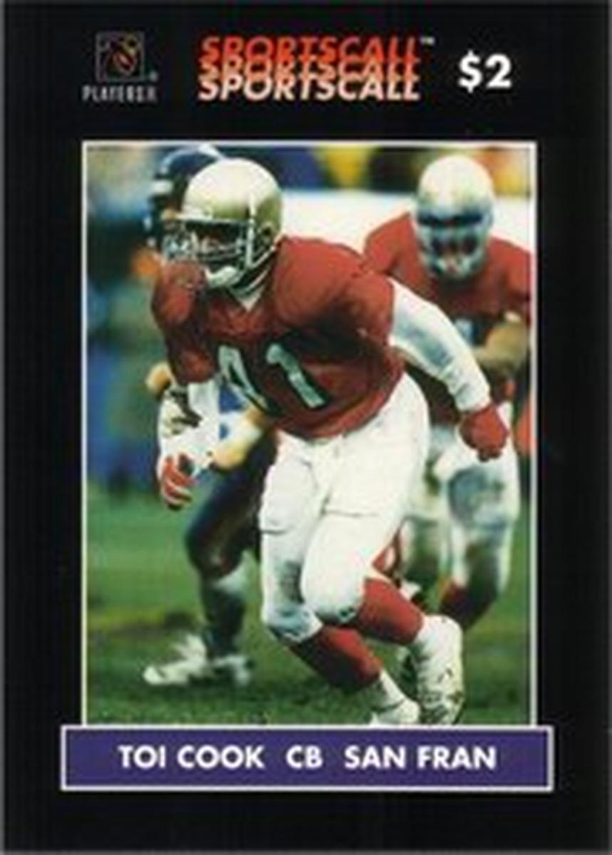 This collectible phone card features Toi Cook, a cornerback for the San Francisco 49ers football team. The card is numbered 26 and is part of the SportsCall series, focusing on NFL players. The NFL logo and "National Football League" appear on the card, identifying it with American professional football.