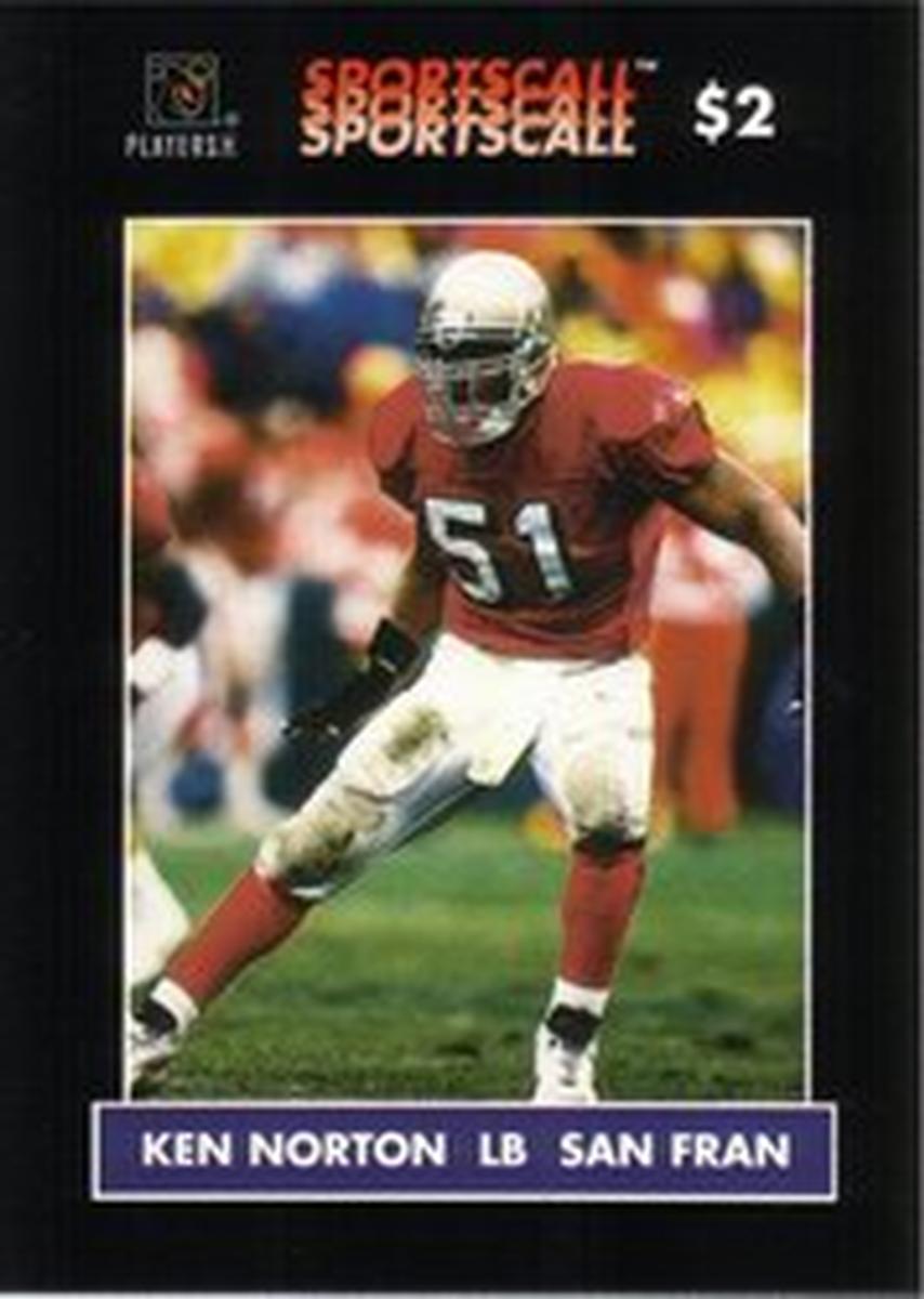This SportsCall paper card represents a specific collectible related to American football and is centered on Ken Norton’s role as a linebacker with the 49ers. The combination of logos and text confirms the card’s connection to the National Football League and its recognition as a licensed sports collectible.