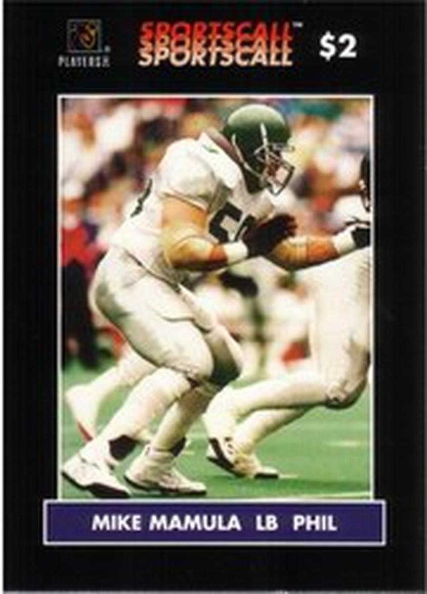 The card includes clear identification of Mike Mamula’s position (LB) and team affiliation with the Philadelphia Eagles. The NFL and Players Inc. logos appear on the card, authenticating its status related to official National Football League merchandise. The design integrates the SportsCall logo prominently, reinforcing the card’s issuance through this brand.