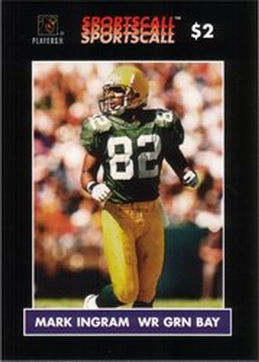 This collectible card features Mark Ingram as a wide receiver for the Green Bay Packers in the National Football League (NFL). The card is numbered 48 and issued by SportsCall. Mark Ingram is shown wearing the Green Bay Packers uniform, predominantly green and yellow in color. The design includes the NFL logo and the phrase “players inc.” prominently displayed. The card’s value is marked as $2 in the upper left corner.