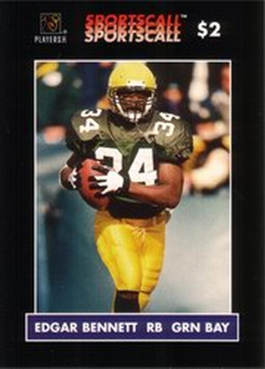This collectible card features Edgar Bennett, a running back for the Green Bay Packers football team, depicted in his team uniform. The card is marked with the number 49 and belongs to the SportsCall series. It highlights the National Football League (NFL) as the overarching sports organization and clearly associates with football, specifically the NFL.