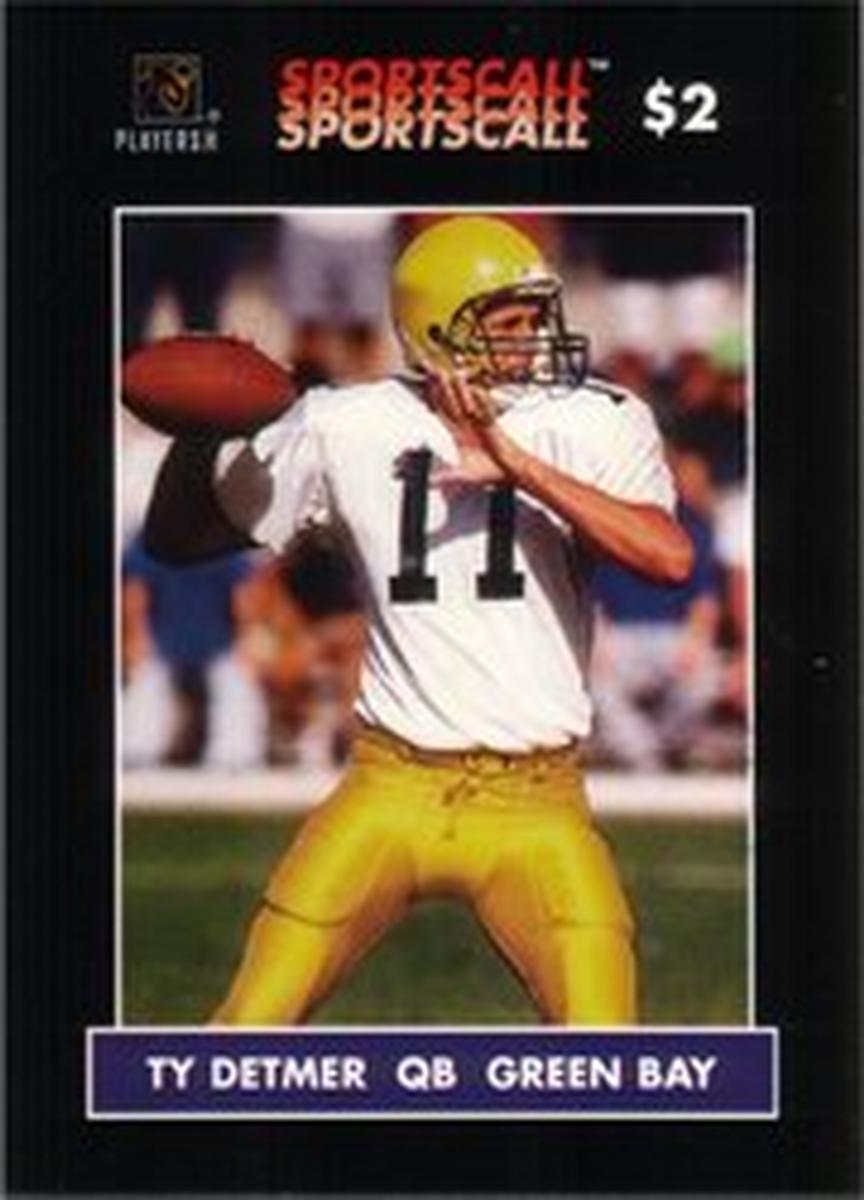 At the top of the card, the words “SportsCall” and “Ty Detmer” are visibly printed, along with the position abbreviation “QB” for quarterback. The National Football League is referenced clearly, linking the player and card to the official league. The team name “Green Bay Packers” is also specified on the front side, affirming the connection to this NFL franchise.