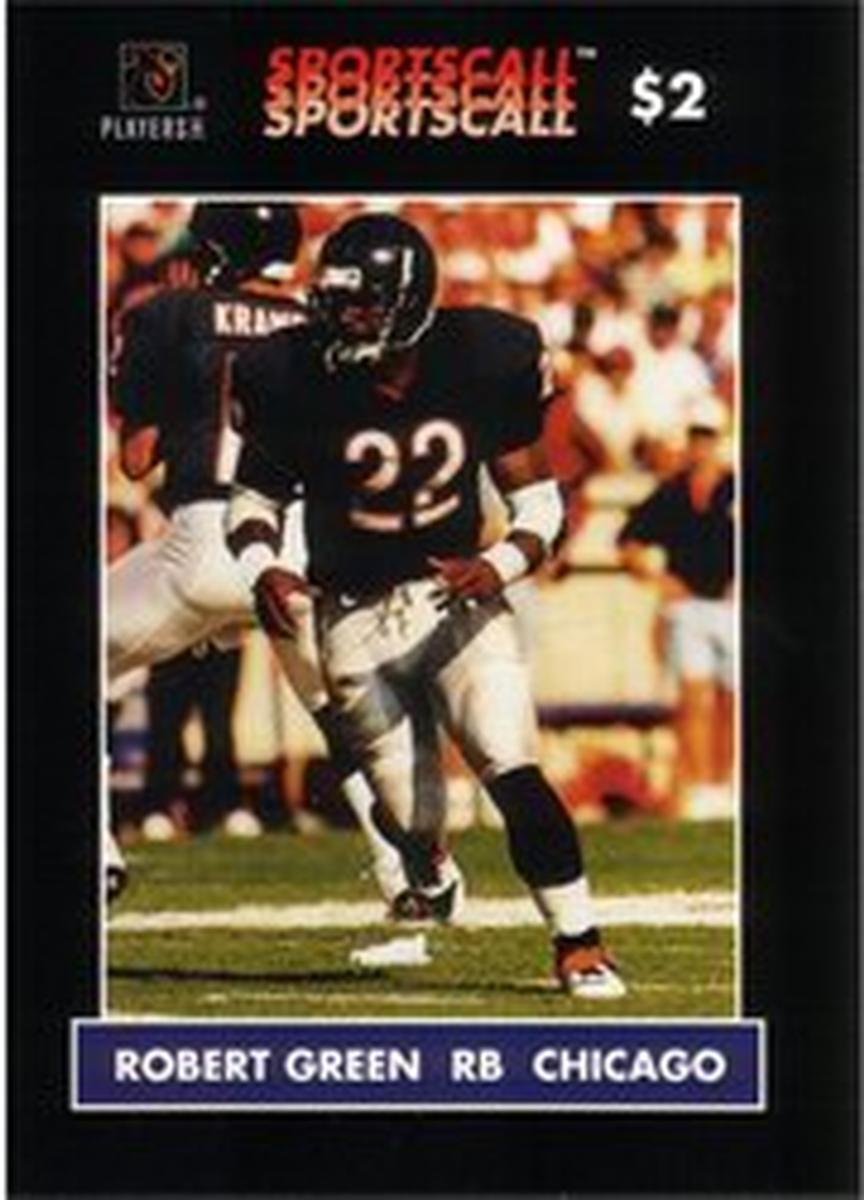 Overall, the card presents Robert Green in his role as a professional NFL player, emphasizing his identity with the Chicago Bears through uniform, name, and team references. The layout highlights the sport of football with official branding and numeric value, making it a collectible item focused on NFL and Robert Green’s player profile.
