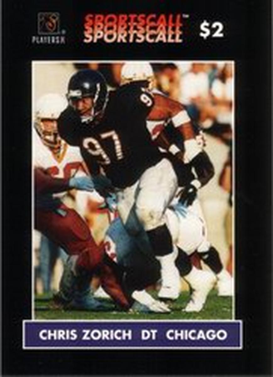 This collectible card features Chris Zorich, a defensive tackle for the Chicago Bears in the National Football League (NFL). The card is numbered 55 and is part of the SportsCall series. Chris Zorich is shown wearing the Chicago Bears football uniform, which includes the team's distinctive colors and logo. The image captures him in action, emphasizing his role on the field.