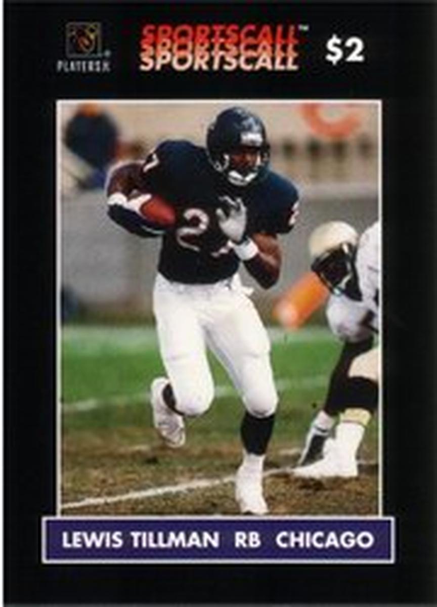 This collectible card features Lewis Tillman, a running back for the Chicago Bears football team. The card is labeled as #59 and is part of the SportsCall series, printed on paper. It prominently displays the NFL and National Football League logos, emphasizing its official connection to the sport. The image of Lewis Tillman shows him in Chicago Bears football gear, including the team's colors and uniform.