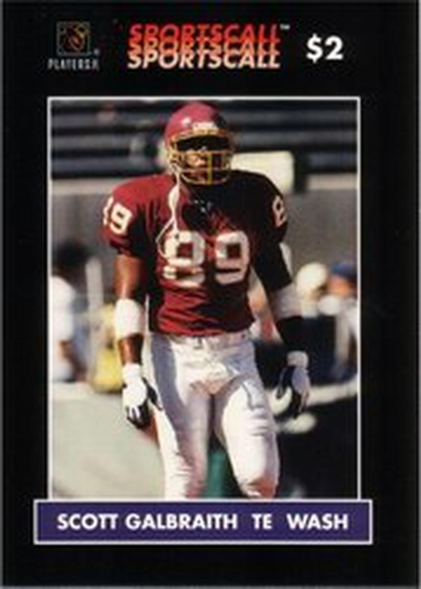 This collectible card features NFL tight end Scott Galbraith in his Washington Redskins football uniform. The image captures Galbraith in action, wearing the team's distinctive burgundy and gold colors. The card is numbered 62 and issued by SportsCall, a company associated with sports memorabilia and collectibles.