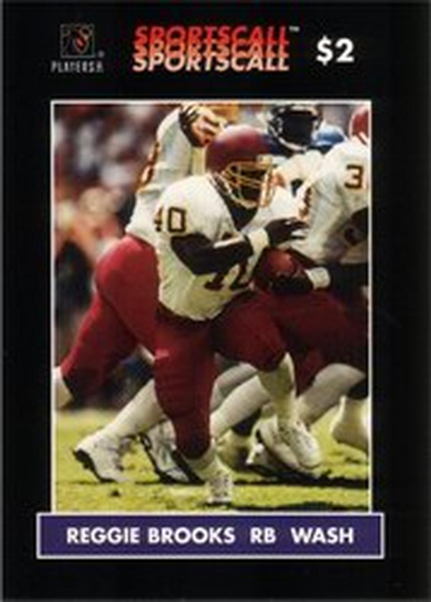 Overall, this SportsCall paper card represents a collectible NFL memorabilia item centered on Reggie Brooks, reflecting his role with the Washington Redskins during his playing career. The visual elements combine to create a focused tribute to the athlete, appealing to fans and collectors of football cards.