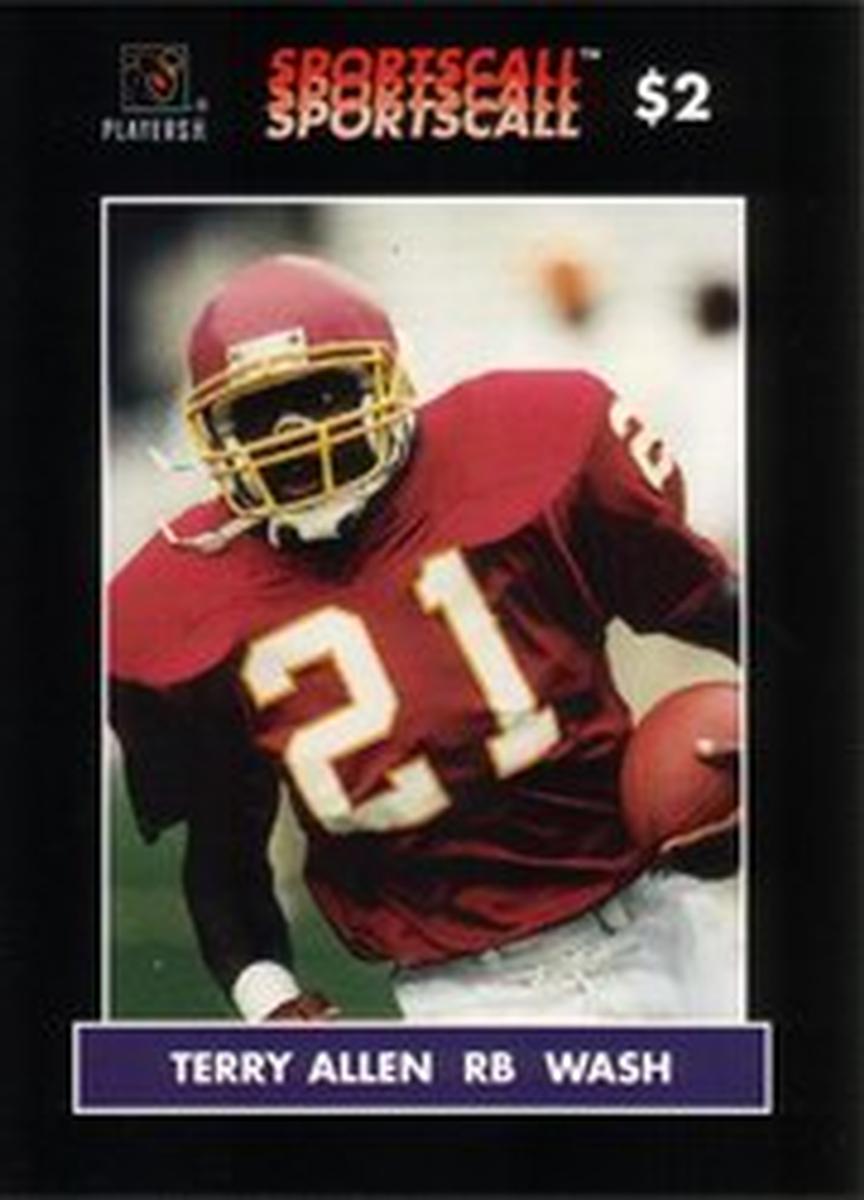 This collectible card features Terry Allen, a running back (RB) for the Washington Redskins football team. The card is numbered #67 and is issued by SportsCall, printed on paper. It highlights Terry Allen in his NFL uniform, which includes the burgundy and gold colors distinctive to the Washington Redskins. The player is depicted mid-action, showcasing his role on the football field for the National Football League (NFL).