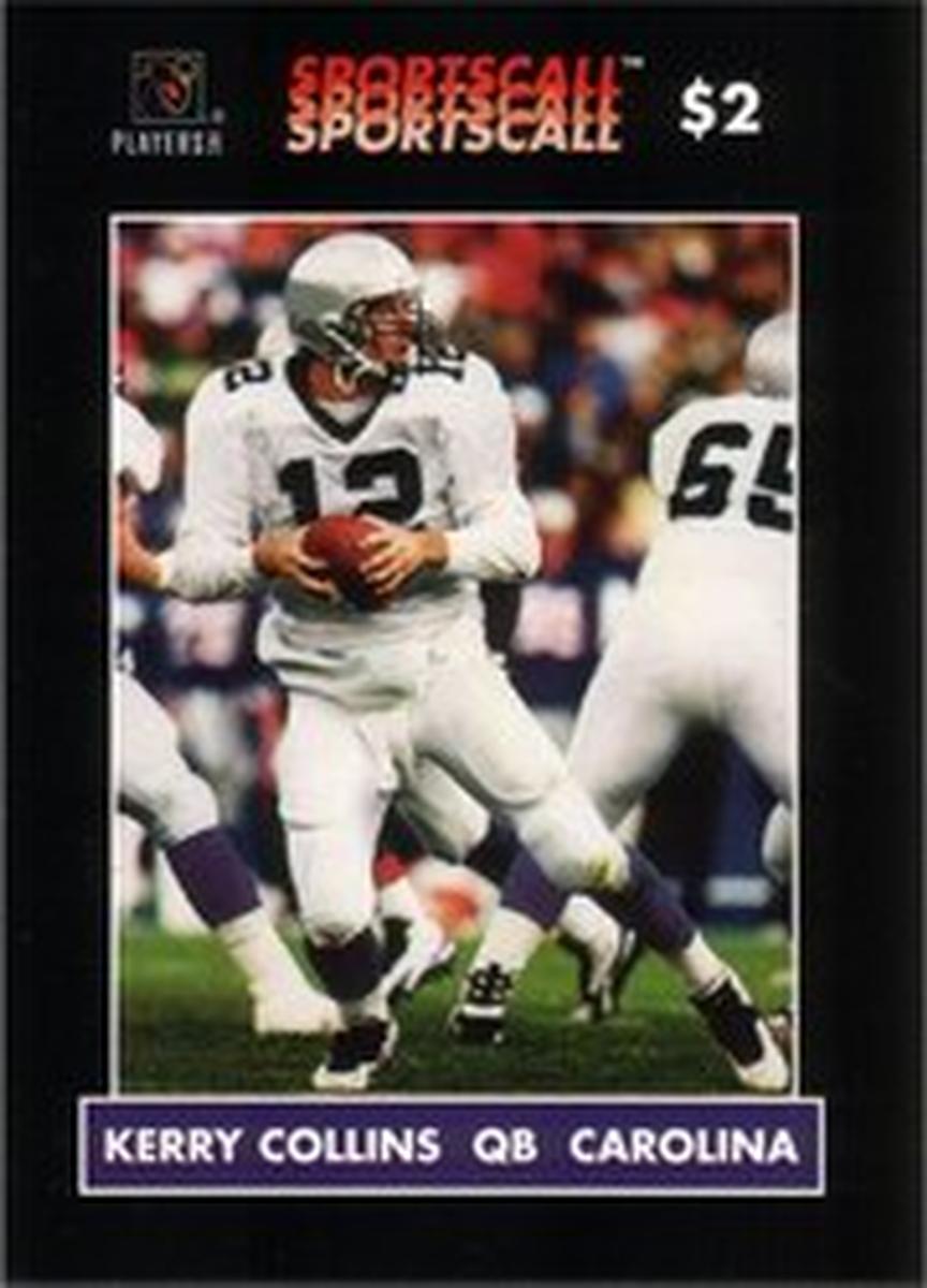 This SportsCall paper card commemorates Kerry Collins’s role as a quarterback in professional football, highlighting his connection to the Carolina Panthers and the NFL through official logos and player imagery. The card is a collectible item for fans of NFL football, specifically those interested in players from the late 1990s to early 2000s era.