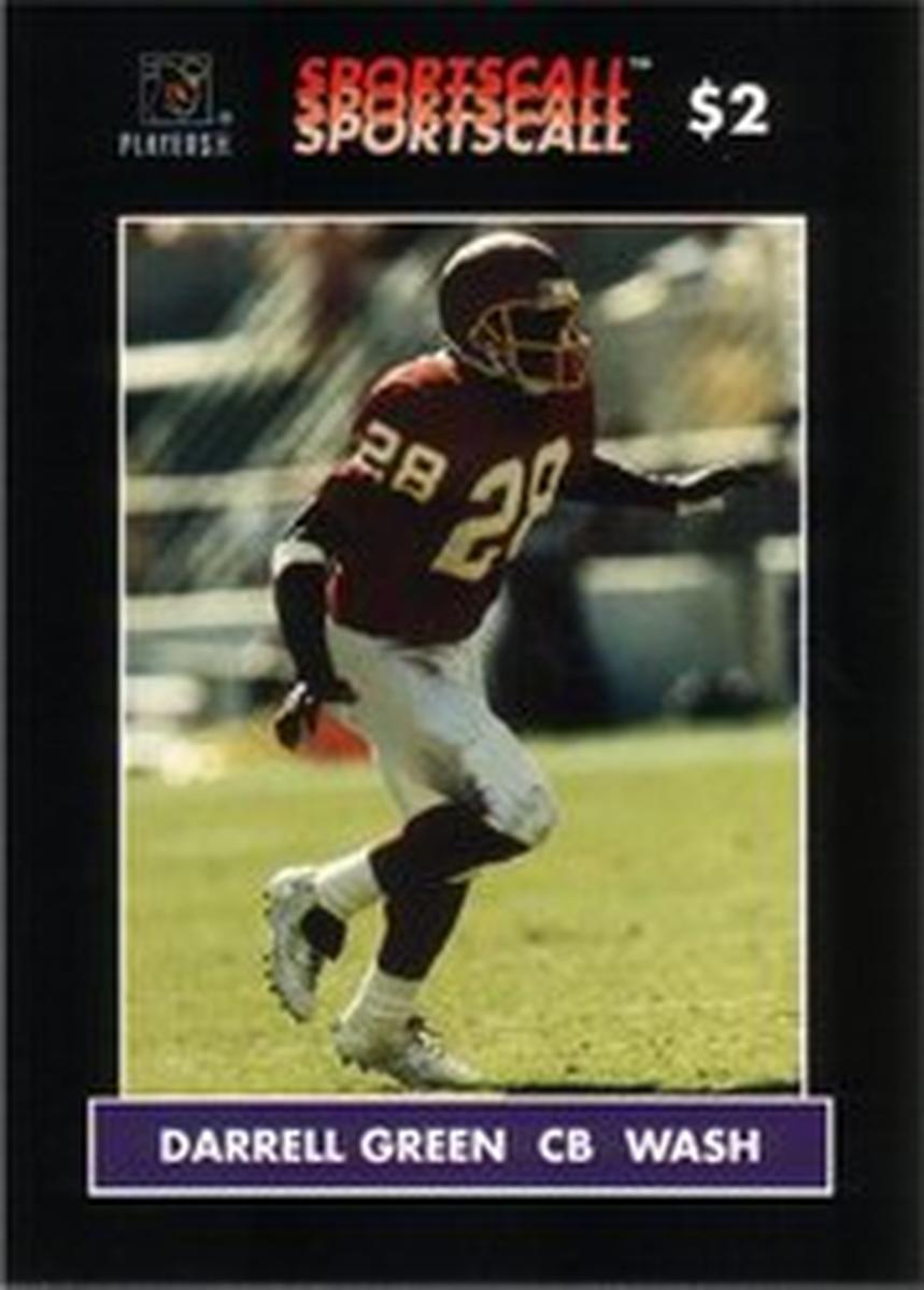 This collectible card features Darrell Green, a cornerback (CB) for the Washington Redskins football team in the National Football League (NFL). The card is labeled with the number 80 and is part of the SportsCall series. Darrell Green is shown in his football uniform, which includes the Washington Redskins colors, and he appears in an action-oriented pose typical for football trading cards. The card also indicates the value of $2.