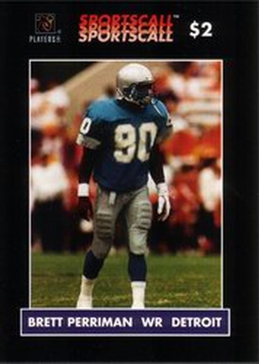 The design highlights an action photo of Brett Perriman in his Detroit Lions uniform, captured mid-play on the football field. The image includes details such as the blue and silver colors of the Lions, as well as the stadium background typical for an NFL setting. The card also features the SportsCall logo prominently displayed, indicating its official licensing and association with the NFL Players Inc.