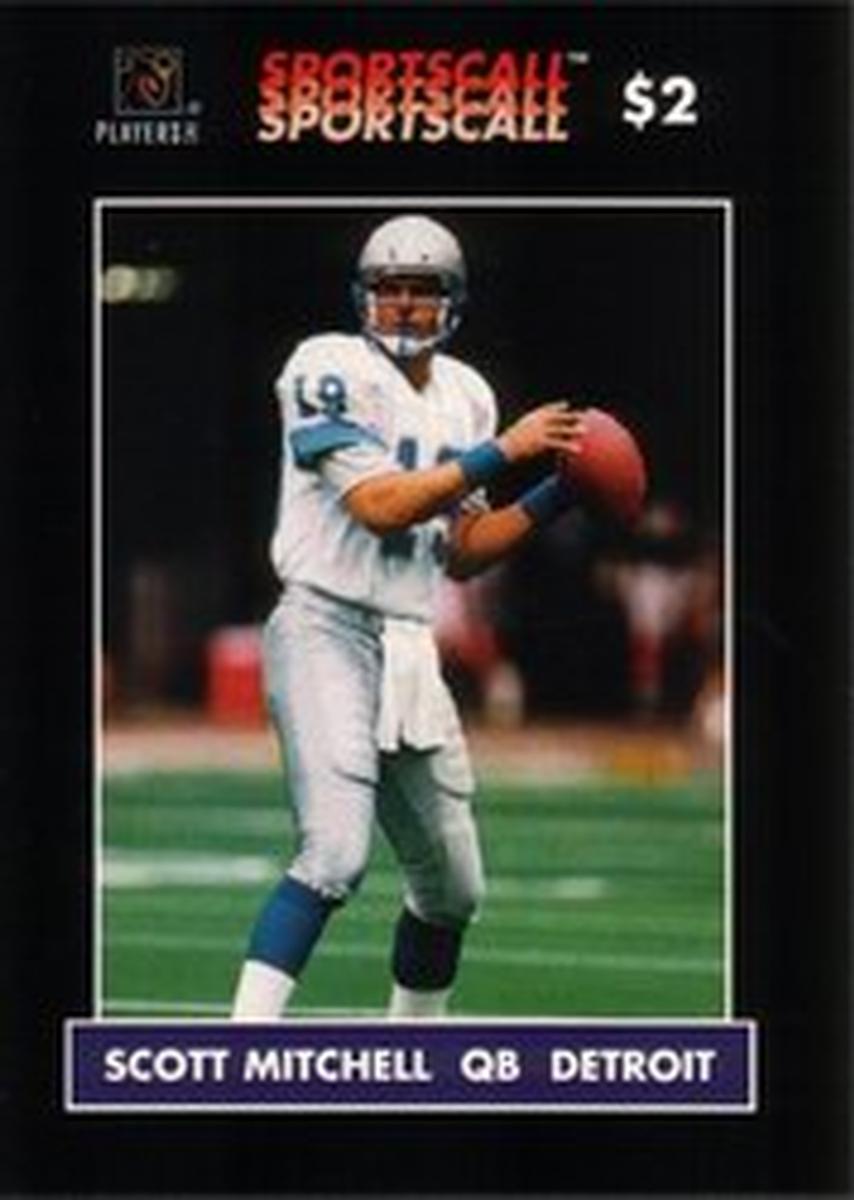 This collectible card features Scott Mitchell, quarterback for the Detroit Lions football team, depicted in full uniform. He is shown in an action pose, wearing his helmet and holding a football as if preparing to throw a pass. The Detroit Lions logo is visible on his helmet, and the card’s design identifies the sport as football under the National Football League (NFL) umbrella.