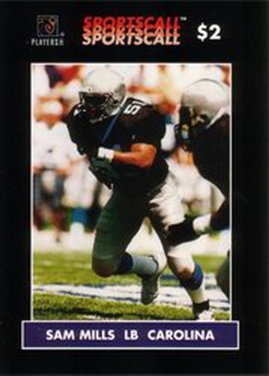 Text on the card includes “Sam Mills (LB Carolina Panthers Football)” along with the card number, 87. The top left corner features the SportsCall logo in red and black, indicating the origin of the card. The NFL and National Football League logos appear on the card, affirming its connection to the professional football league. There is also a $2 denomination printed on the card, showing its collectible value.