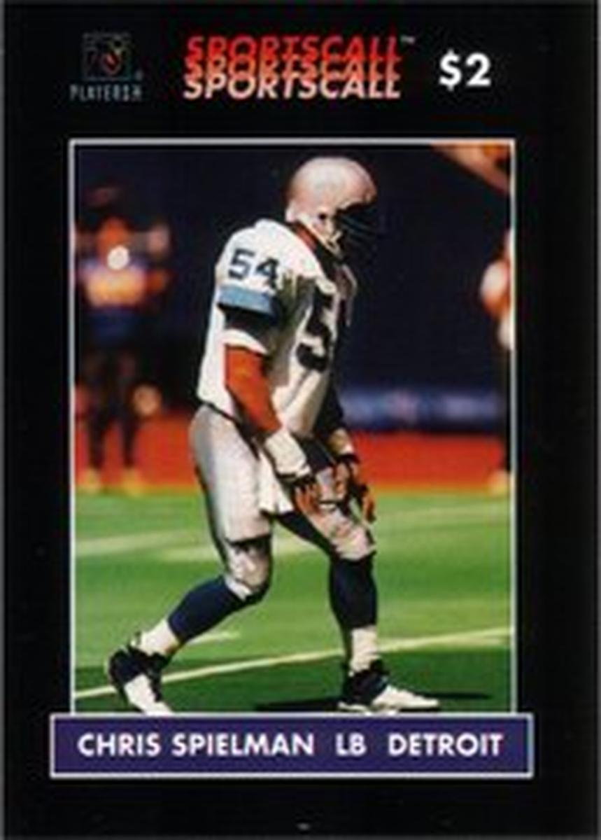 Text elements on the card include "Players Inc." and the player’s name, Chris Spielman, reinforcing its official NFL licensing. The card is a collectible item dedicated to NFL football and the Detroit Lions, with a focus on Chris Spielman’s role as a linebacker.