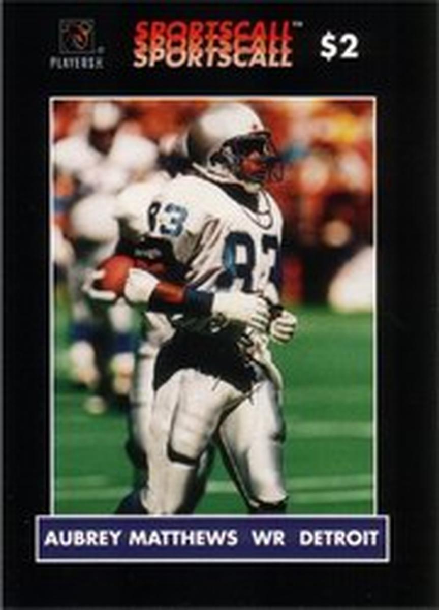 The card is printed on paper and falls under the Sports category, specifically football. It is an officially licensed NFL card featuring Aubrey Matthews and the Detroit Lions, part of the SportsCall collection. The colors, logos, and text layout emphasize the card’s focus on NFL players and football fandom.