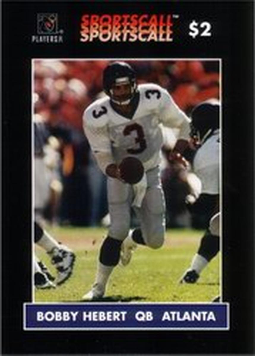 At the top right corner, the numbers "99" indicate the card number in the series. The lower part of the card contains text that reads "Bobby Hebert", "QB", and "Atlanta Falcons Football," confirming the player’s position and team affiliation. The card is issued by SportsCall and printed on paper, identifying it as a collectible item connected to American football.