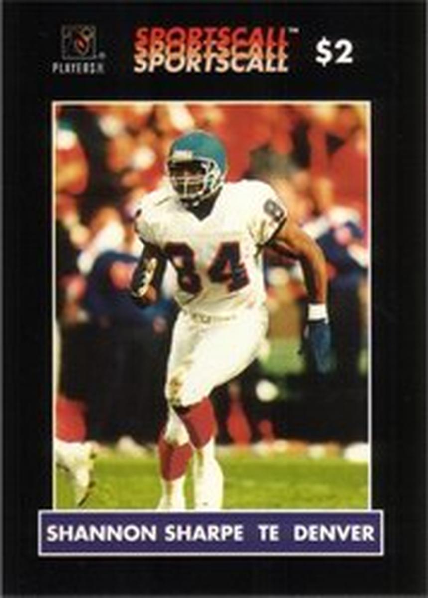 The card includes the SportsCall branding, linking it to sports collectibles focused on football. The design places emphasis on Sharpe’s role as a key player for the Denver Broncos, with his name and position printed prominently. The official NFL shield logo is also displayed, further authenticating the card's association with the National Football League.