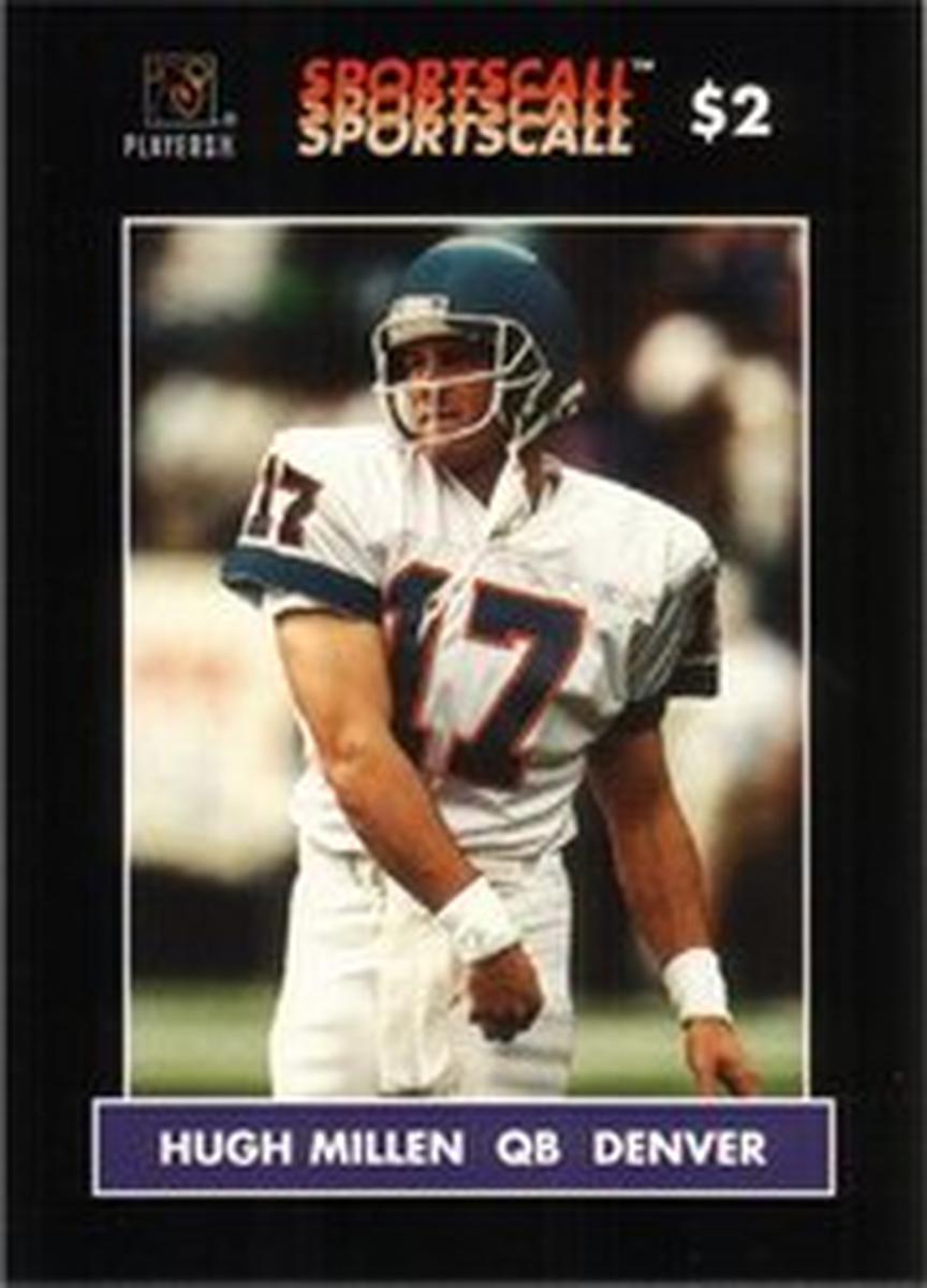 This collectible card features Hugh Millen, a quarterback for the Denver Broncos in the National Football League (NFL). The card is identified as #108 from SportsCall and prominently displays Millen in his Broncos uniform. The image captures Millen in action, wearing his team's helmet and football gear, set against a clean, solid background that highlights the player.