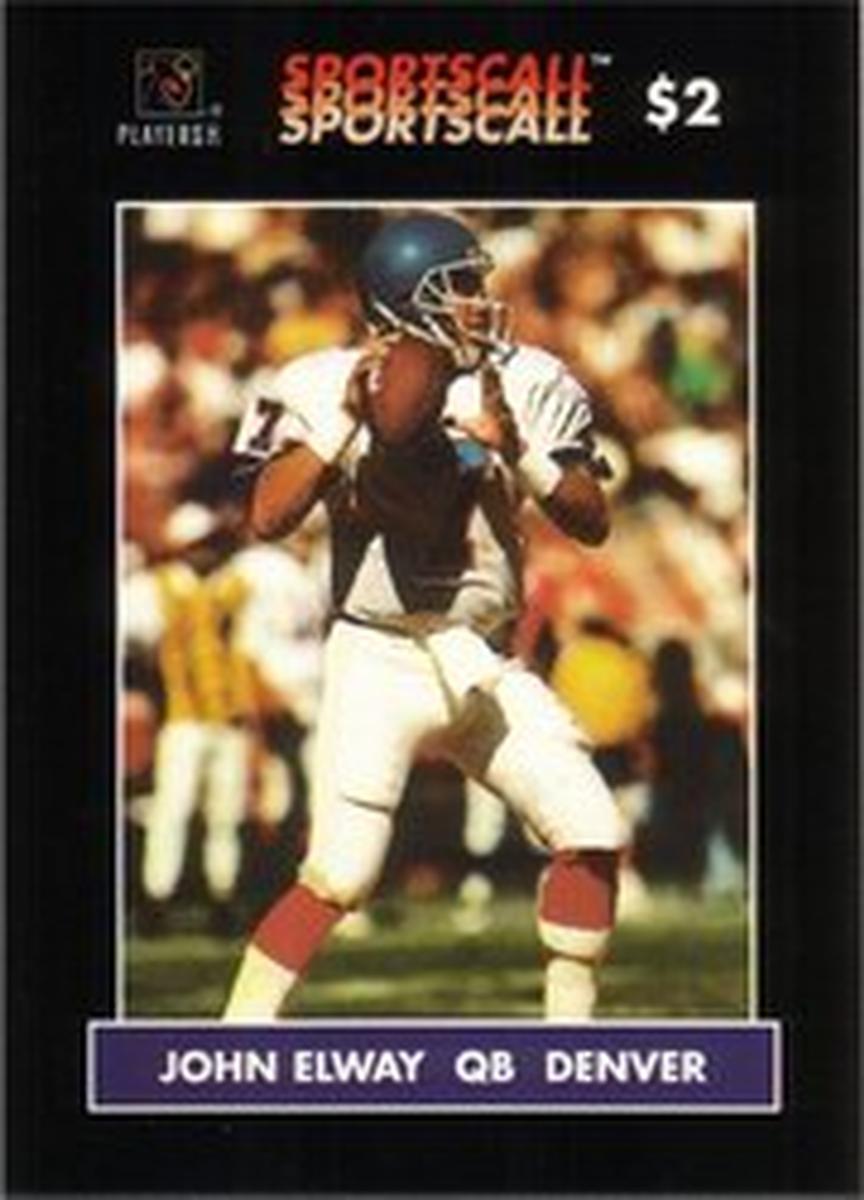 The front of the card includes SportsCall branding and presents John Elway in an action pose or portrait, emphasizing his importance as an NFL quarterback. The Denver Broncos logo or colors may be present, reinforcing the team connection. The overall presentation is clean and focused on football, suitable for collectors interested in NFL players.