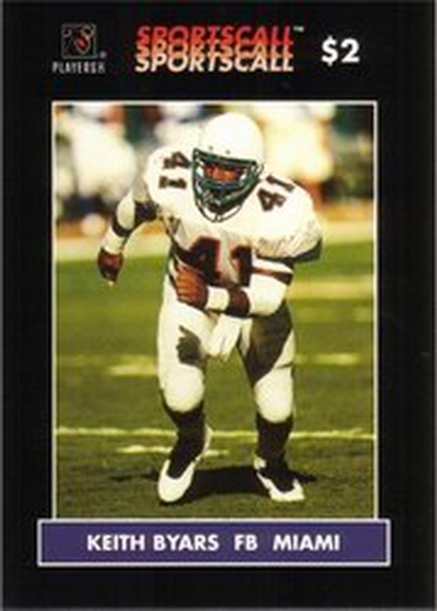 This collectible card features Keith Byars, a fullback who played for the Miami Dolphins in the National Football League (NFL). The card is clearly labeled with his name “Keith Byars” and includes the team affiliation “Miami Dolphins.” It shows Byars in football attire prominently displaying his NFL role. The card is numbered #111 and is associated with the SportsCall brand in paper format. The colors and design elements reflect a traditional football trading card style, focusing on the player’s image and team details.