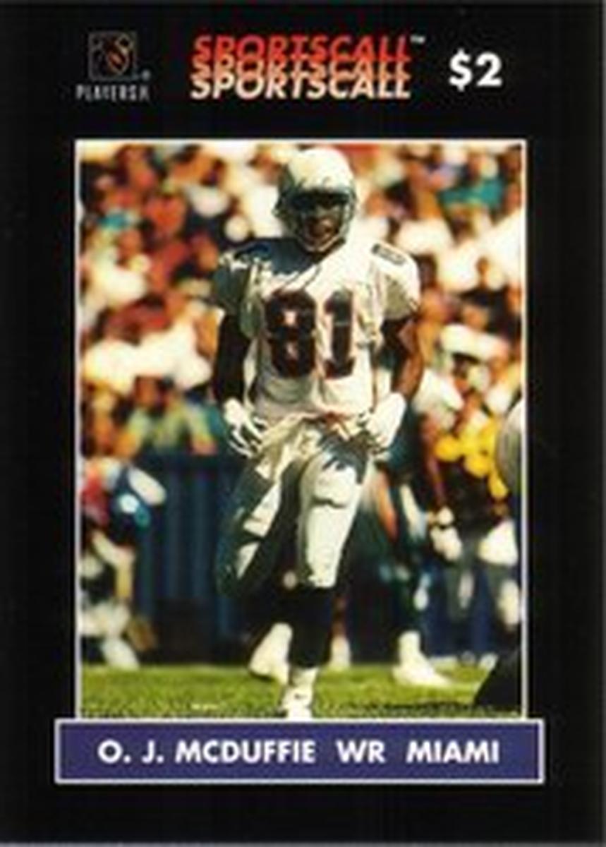 This card comes from a subset of National Football League player collectible cards focused on NFL players, highlighting O.J. McDuffie’s career with the Miami Dolphins. It is a paper card issued by SportsCall, part of a series dedicated to football athletes. The visual elements, player identification, and official league logos certify its connection to professional American football.