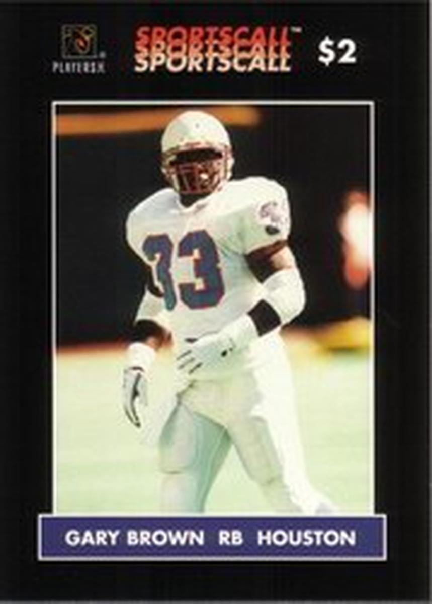 This collectible card features Gary Brown, a running back for the Houston Oilers football team. It is a SportsCall paper card from the National Football League (NFL), associated with the Players Inc. program. The main image captures Gary Brown in full football gear, wearing the Houston Oilers’ uniform, including the distinctive helmet and jersey. The card prominently displays his position (RB) and team name alongside his image.