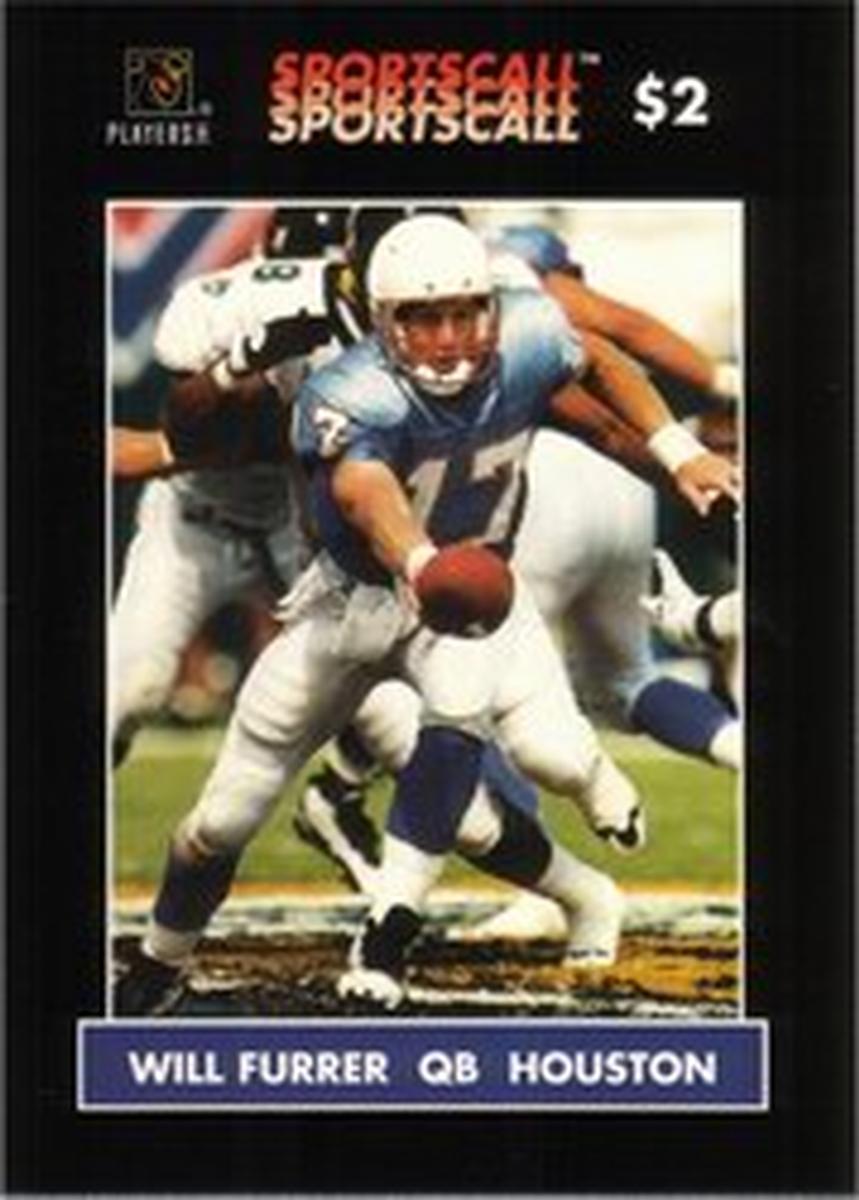This collectible card features Will Furrer, quarterback for the Houston Oilers football team. The card shows a posed image of Will Furrer dressed in his Houston Oilers uniform, including the helmet and jersey, captured in a portrait-style photograph. The team name, Houston Oilers, is visible on his uniform. The card number is 136, and it is branded as a SportsCall collectible, printed on paper.