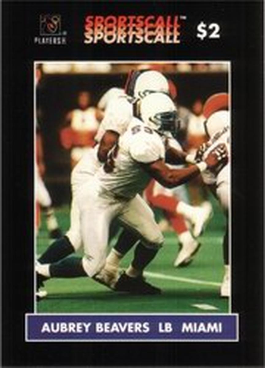 The card highlights Aubrey Beavers as an NFL player with positional emphasis on linebacker (LB). The design incorporates action imagery with a focus on Beavers, emphasizing his role in professional football. Text on the card clearly identifies the player’s name, team affiliation, and position.
