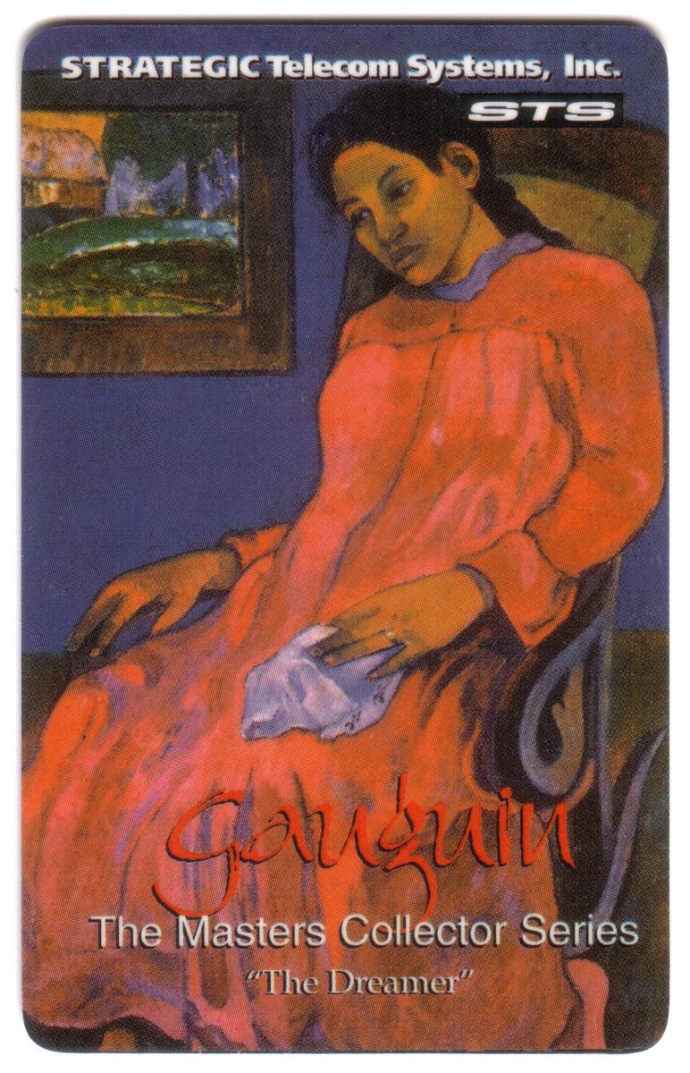 This collectible phone card features artwork from Paul Gauguin’s The Masters Collection, specifically showcasing the painting titled "The Dreamer" with Tehura, a Tahitian woman who was a frequent subject in Gauguin’s work. The image presents an impressionist or post-impressionist artistic style, reflecting Gauguin’s distinctive use of bold colors and expressive brushstrokes. The card highlights a serene and contemplative portrait set against a vibrant backdrop, capturing the essence of Gauguin’s Tahitian period and his artistic reverie.
