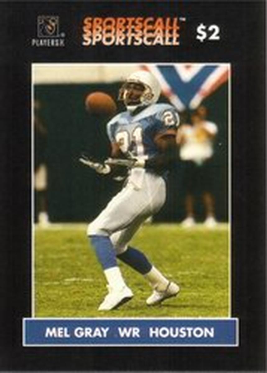 This collectible card features Mel Gray, a wide receiver for the Houston Oilers football team, prominently displayed in the center. Mel Gray is shown wearing his Houston Oilers uniform with a helmet and a white jersey. The card background is primarily in shades of blue with a dynamic pattern, highlighting the player. The upper left corner carries the SportsCall logo, indicating the card’s origin. The NFL and National Football League logos appear along the top edge, emphasizing the official licensing and sports association.