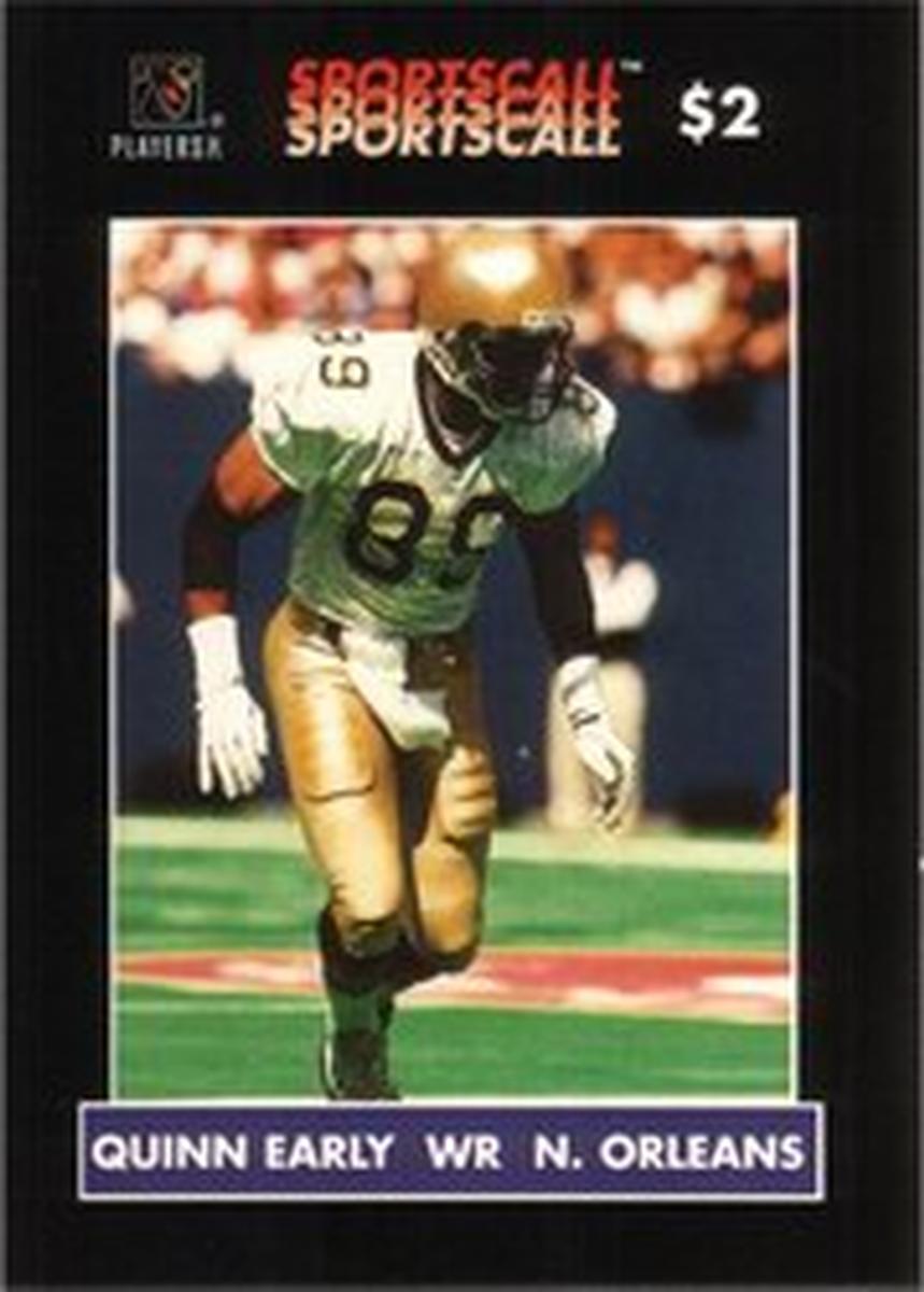 The card is numbered 151 and was produced by SportsCall on paper material. The overall design incorporates a green border framing the image of Quinn Early in action, emphasizing the dynamic aspect of the sport. The text “Quinn Early (WR New Orleans Saints Football)” is printed clearly on the card, providing essential information about the player’s position and affiliation. The NFL shield logo appears near the bottom-left corner, authenticating the card’s league association.