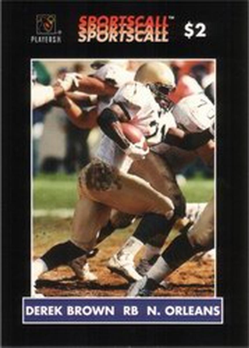 The background of the card has a blurred stadium scene with green turf and indistinct spectators, emphasizing the player in the foreground. The upper part of the card includes text displaying "NFL Players Inc." and "Derek Brown (RB New Orleans Saints Football)," confirming the player’s identity and position. The NFL logo and SportsCall branding are also present, reinforcing the card's official connection to the National Football League and its collectible series.