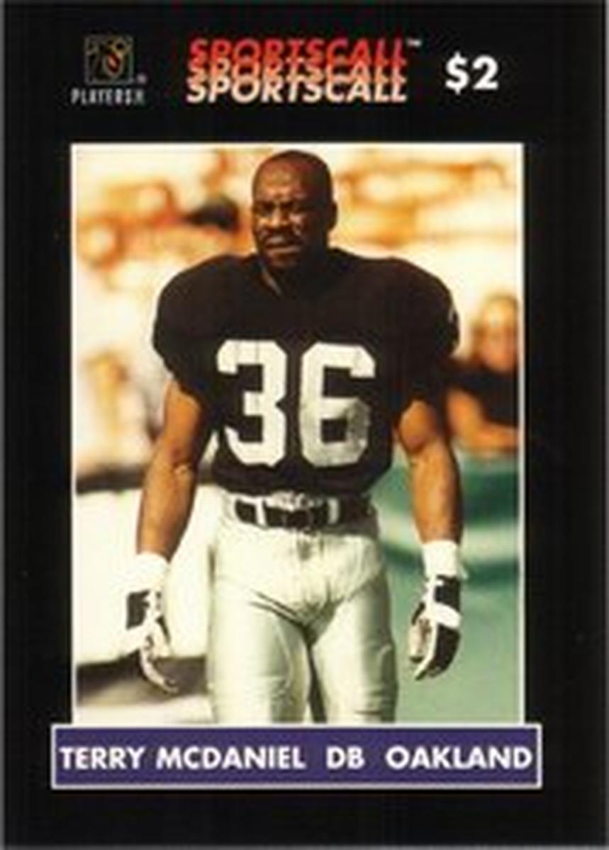 This collectible is a SportsCall product connected to NFL football memorabilia, celebrating Terry McDaniel’s career with the Raiders. The card’s presentation is straightforward with visual emphasis on McDaniel in his football gear, making it a notable item for fans of the Oakland Raiders and collectors of NFL player cards.