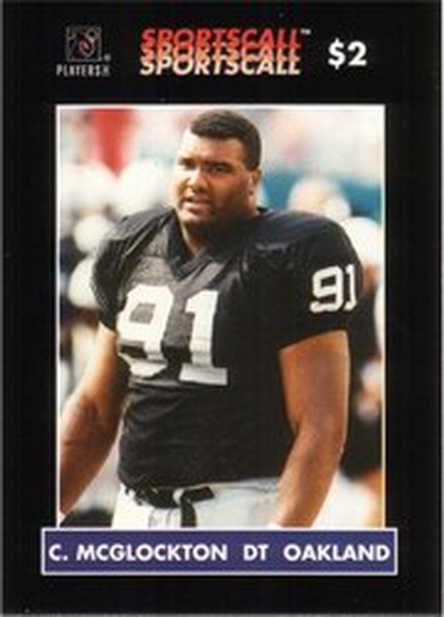 The design includes the player name "Chester McGlockton" clearly shown along with his position and team affiliation. The background of the card is simple, with a predominantly green color that helps emphasize the photograph of McGlockton in action. The NFL Players Inc. and SportsCall logos are visible, underlining its official licensing and source.