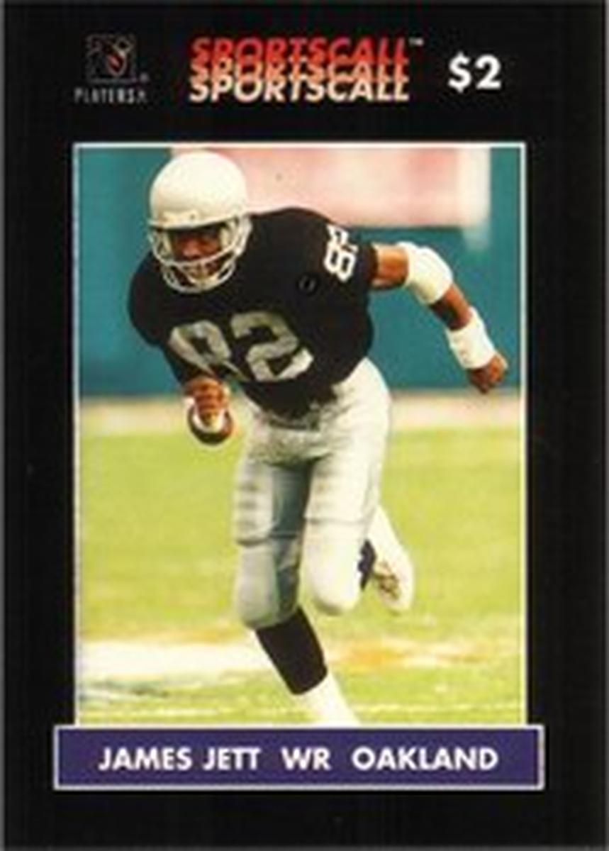 This card represents a specific collectible piece from the National Football League's licensed products, highlighting the athlete in full game gear during play. The card’s design is clean, with a focus on James Jett’s image as a professional football player. The NFL and SportsCall logos and proper player information are displayed clearly.